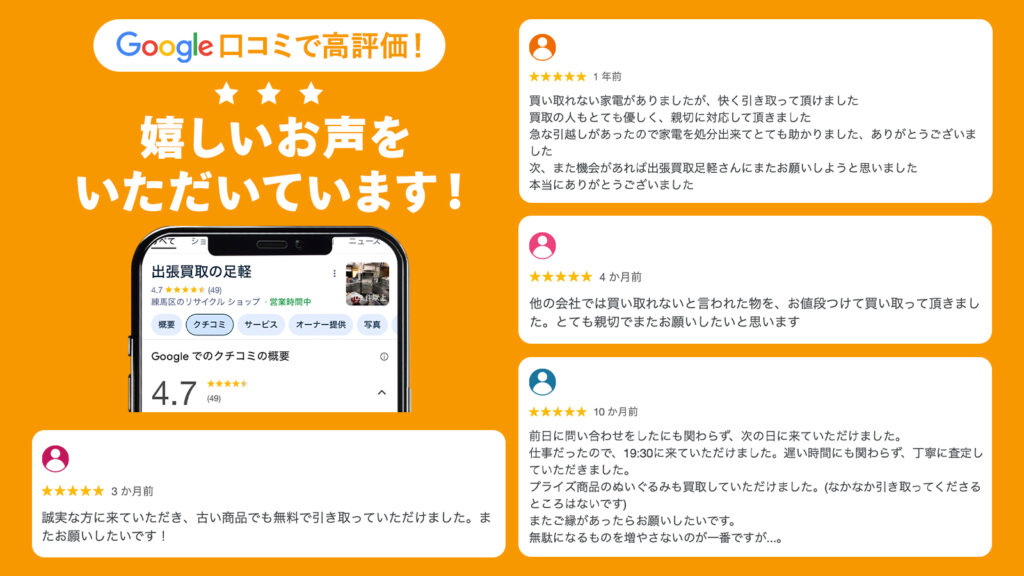 出張買取センター24Hは、ご利用いただいたお客様からGoogleレビューで高評価をいただいております。買取をご検討中の方は、ぜひ出張買取センター24Hにご相談ください。